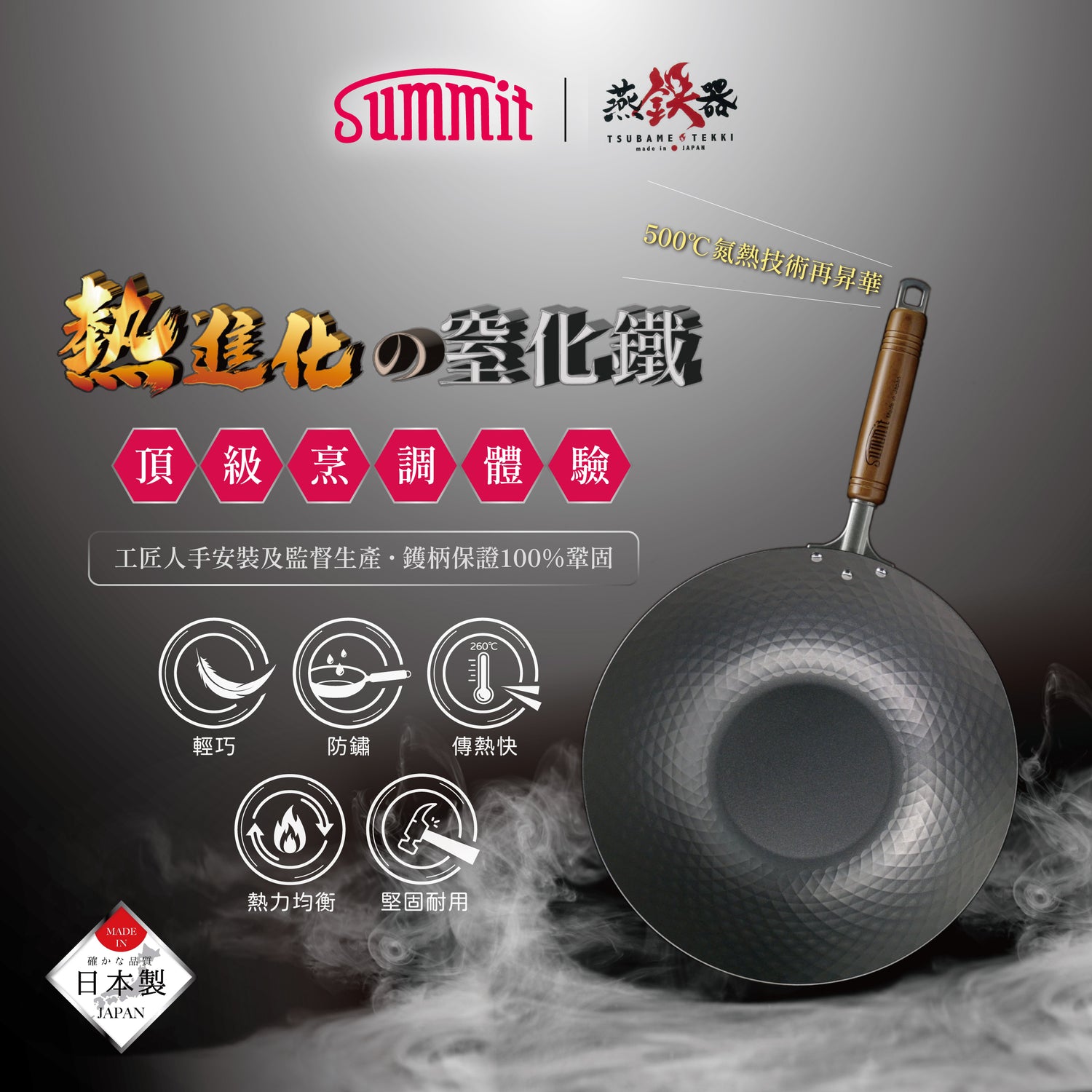 日本工匠了解到大家最關心的問題【 鐵鍋 = 重 + 生鏽 】, Summit 頂級窒化鐵系列一次過為你解決了這個問題,將航空機械專用的尖峰技術──窒化工藝投入到鐵鍋界中,透過高溫滲氮將純鐵氮化處理,讓鐵鍋更容易打理。