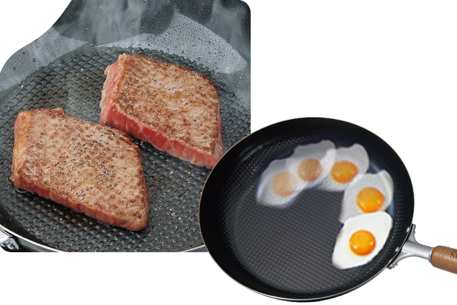 3. 鍋身及鍋底的凹凸紋理可托起食物、使多餘油脂滲入凹紋中,防止黏底,