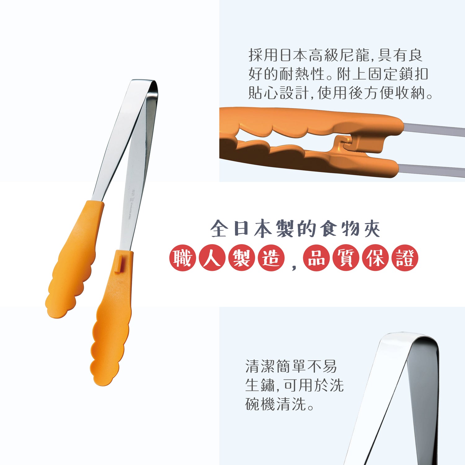 我們這一款單手都能利落使用或鎖上的食物夾,大大幫助你在夾取柔軟食物時,如意粉或幼麵等;可以把麵夾起時,再鎖上固定扣,食物就會滑走,過程中你更是省力不少呢。