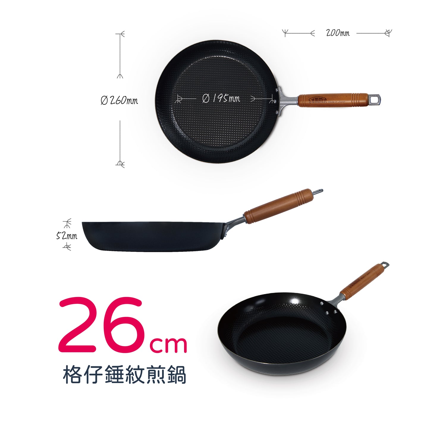 獨特的格紋帶來鎖住水份不油膩的美味佳餚 日本燕三条製鐵流 Summit 格仔錘紋煎鍋,鍋身至鍋底壓成凹凸紋理,目的是利用鍋底凸紋托高食材,食物不會直接貼住鍋底,中間的罅隙會產生水蒸氣,防止黏底。另外,煎肉時過多的油脂亦會滲入空隙,使肉類口感不會太油膩。 如何開鑊?鐵製鍋具,只需用熱水清洗及以少許油潤鍋,省時方便。 平面鍋底,適用於感應式爐灶如電磁爐。