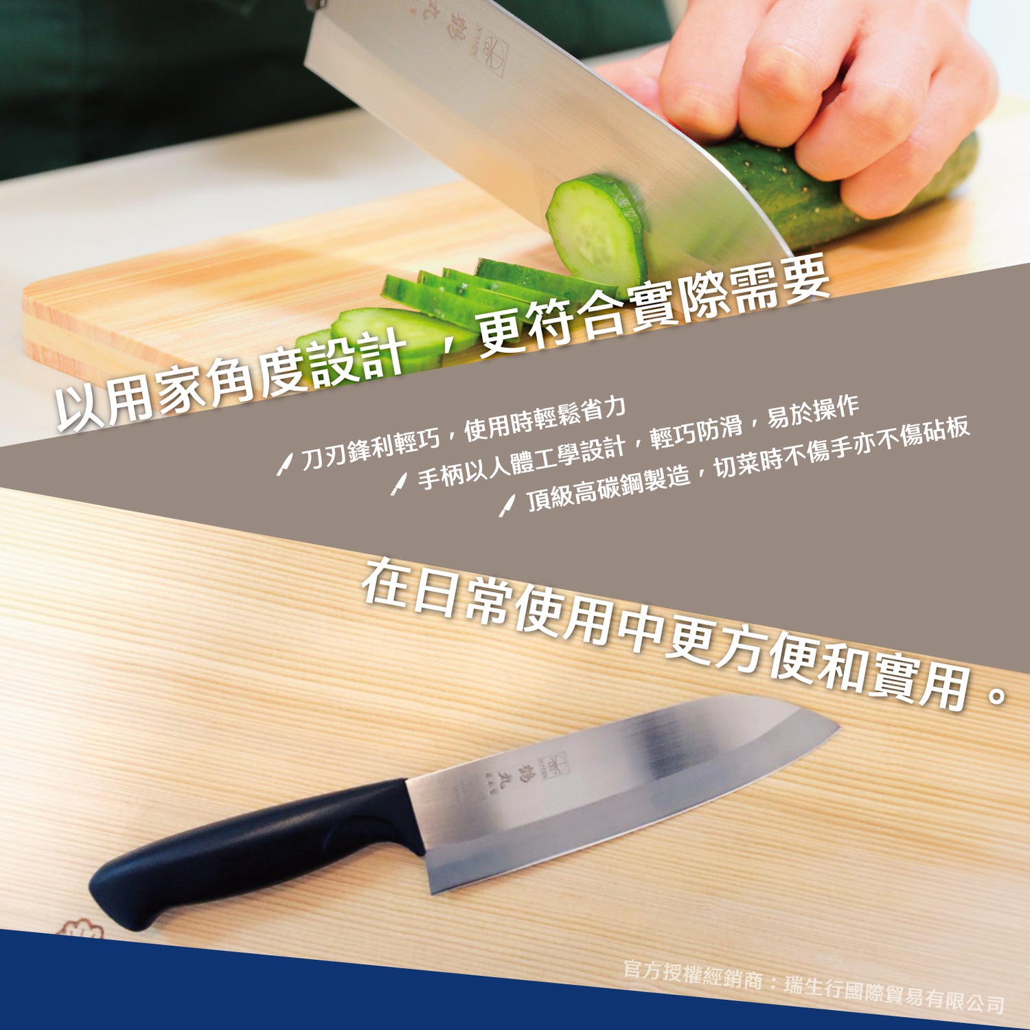 三德刀是一把萬用的刀具,一般煮食所需「切」「片」「剁」都應付有餘。刀具以首屈一指【日本高碳鋼】堅硬度和柔韌度達到平衡,刀工俐落又省力,切菜不傷手亦不傷砧板。